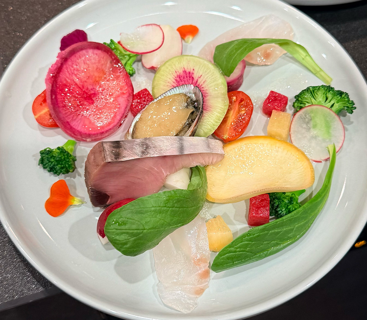 真鯛のマリネ 鰹とナガレコのコンフィ 季節の野菜